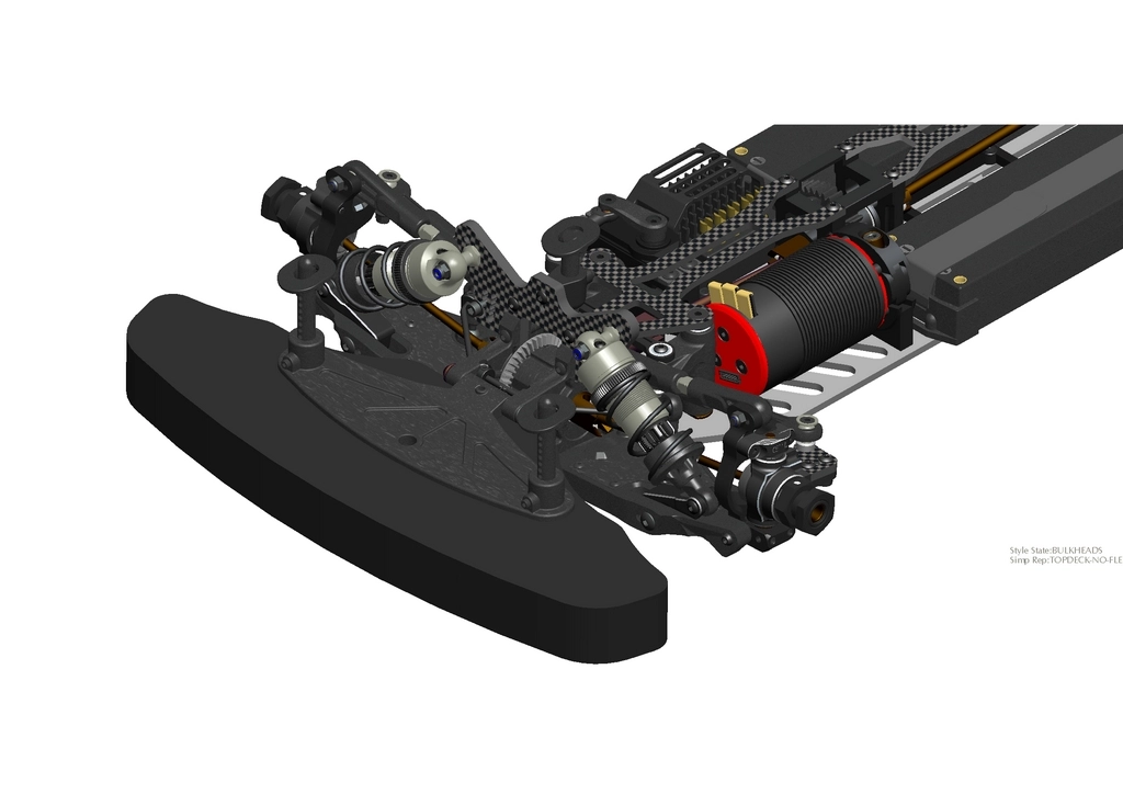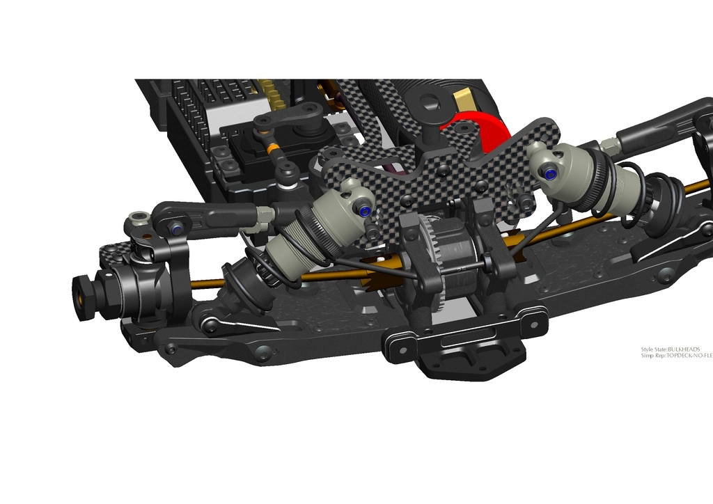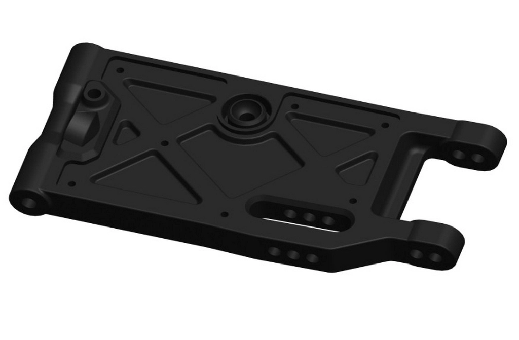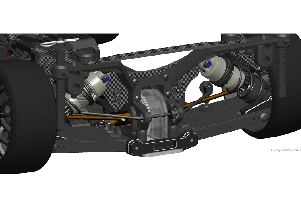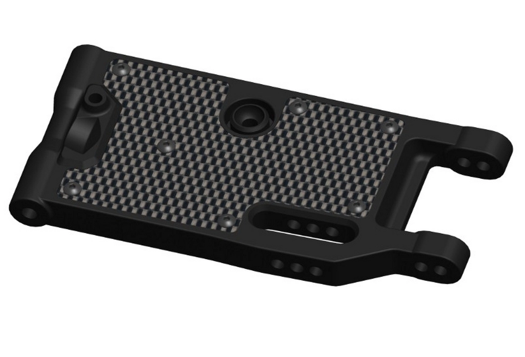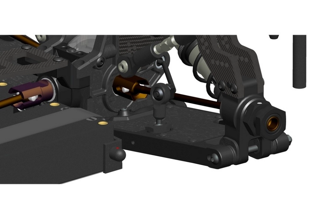 The front and rear suspension arms are constructed from a more rigid composite material, allowing for a broader and more practical range of adjustment. The arms feature cover plates that can be added, removed, or replaced with Carbon fiber options. This versatility serves multiple purposes, including aesthetic enhancements and performance improvements.